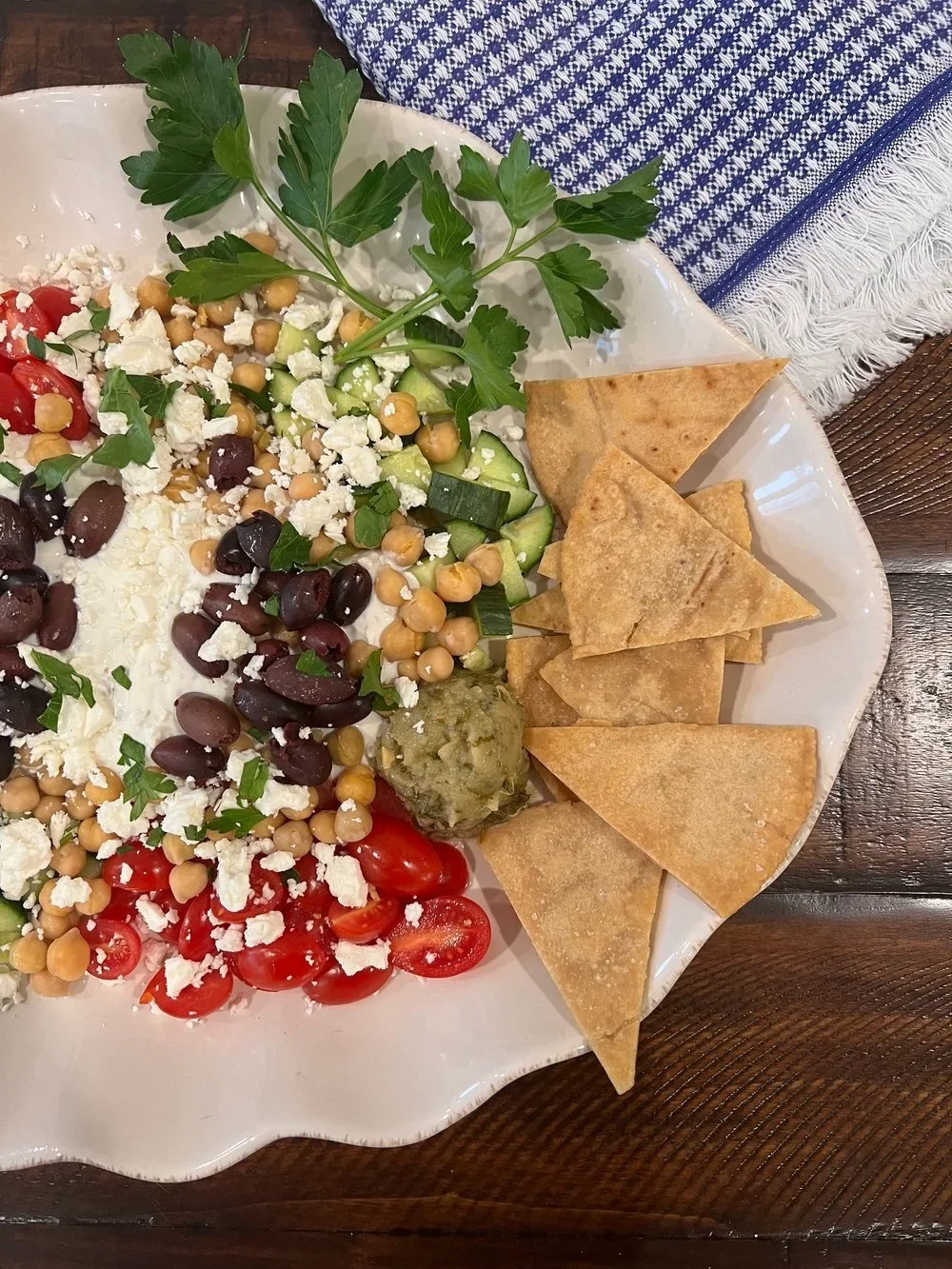 I used actual Pita Bread, cut into triangles. You can toasted them in the oven, coated with olive oil and salt if you’d like, or you can use Pita Chips or Crackers.