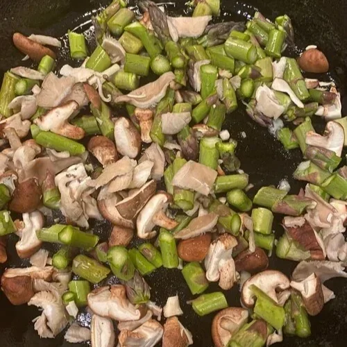 Add asparagus and mushrooms. Sauté until soft, about 3-5 minutes.