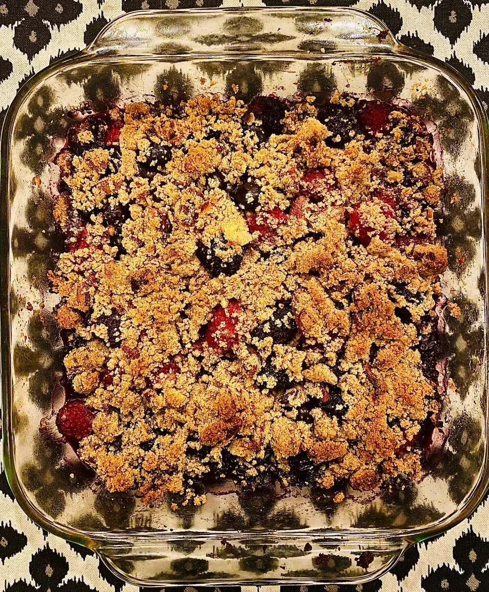 Recently I bought a bunch of berries- blueberries, raspberries, and blackberries- because they were on sale. I proceeded to support my local restaurants a little too much during the week, and had a bunch of things in my fridge I needed to use up. Crumbles are an easy way to use a lot of fruit fast, so that’s what I made.