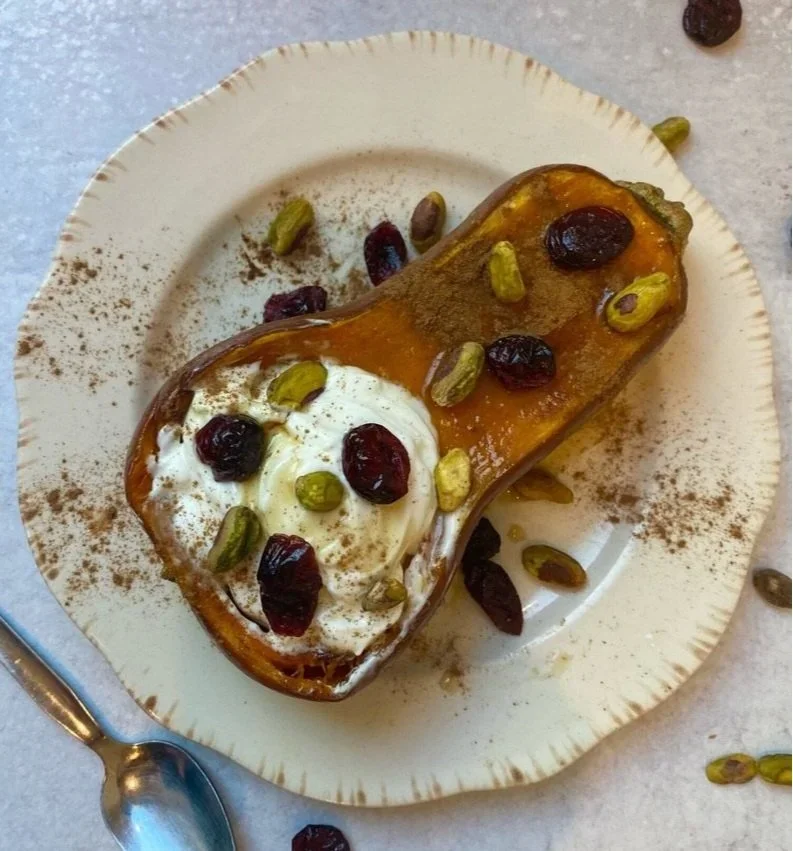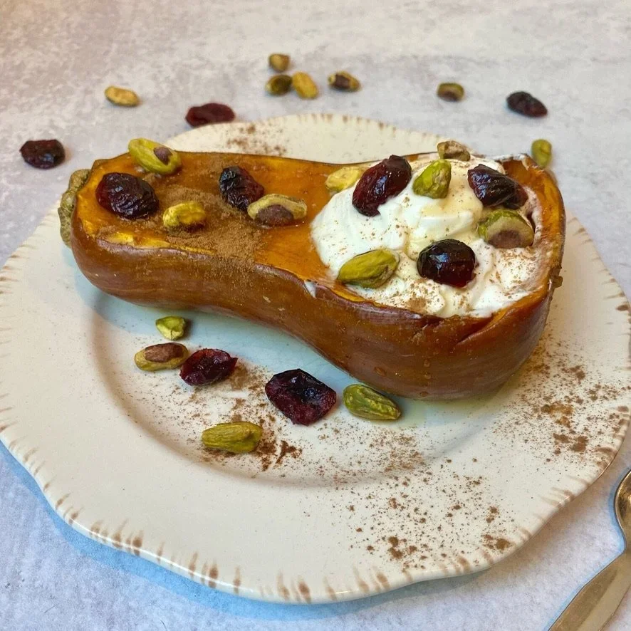 Once the squash has cooled slightly, place a dollop of Greek Yogurt or Vanilla Ice Cream in the hollowed out part of the squash.