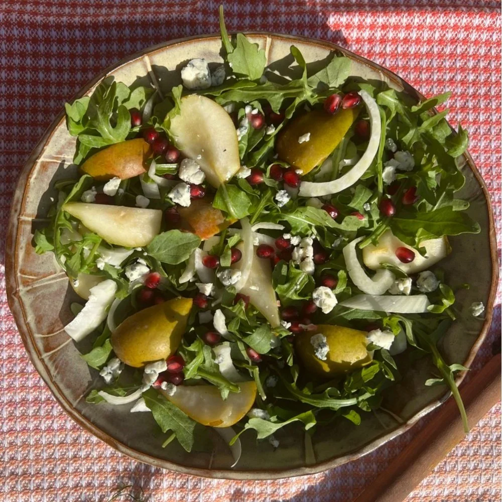 I love when the weather gets cooler, and the local arugula appears at the market. It’s one of my favorite greens, and it holds up to hearty fall produce to make the perfect salad, no matter what you add to it. This salad adds another favorite of mine, fennel, along with some pears, pomegranate seeds, and of course a touch of blue cheese. It’s like a beautiful fall day on a plate.
