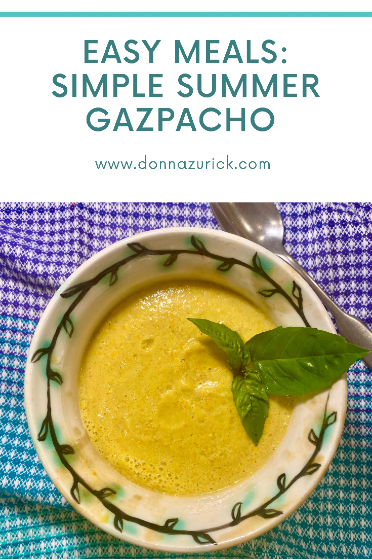 I bought a bunch of gorgeous yellow cherry tomatoes at the Market recently, and decided I was going to make Gazpacho with them. I also used a Yellow Bell Pepper for this recipe to make it extra sunny in color. You can use any color tomatoes and peppers you like, just keep in mind you’re blending everything together, so if you get too wild, it may turn out looking like mud.